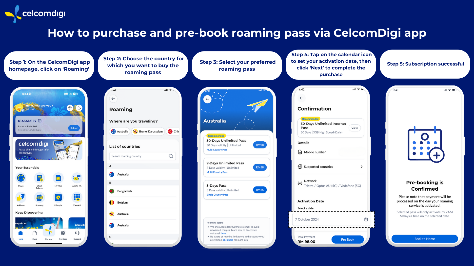 You can purchase your roaming pass via CelcomDigi, Celcom Life & MyDigi app. You can only pre-book your pass in advance via CelcomDigi & MyDigi app. Please refer to the steps below: