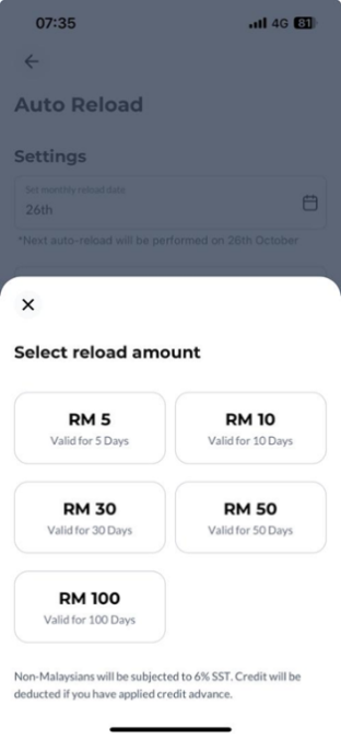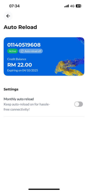 | Auto Reload via CelcomDigi App | Step 1: On the homepage, click ‘View All’ under the ‘Your Essentials’ section, then select ‘Auto Reload’