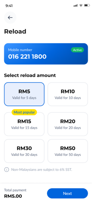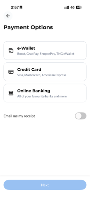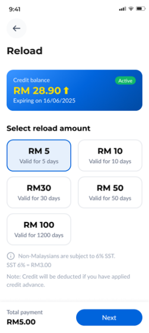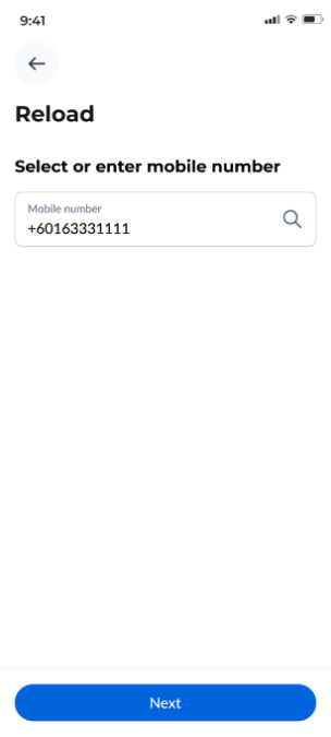 ![]() Step 3: Select your preferred payment method and click ‘Next’ to proceed with the payment. Reload for Others Step 1: On the homepage, click ‘View All’ under the ‘Your Essentials’ section, then select ‘Reload for Others’