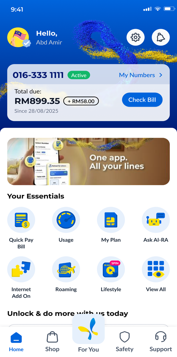 Step 1: On your CelcomDigi app homepage, tap on 'My Numbers' beside your mobile number. | ![]() |