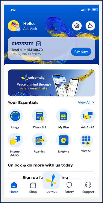 Step 1: On your CelcomDigi app homepage, you can click on ‘Pay Now’, or click on 'View All’ option under Your Essentials section and select ‘Pay Bill for Myself’.