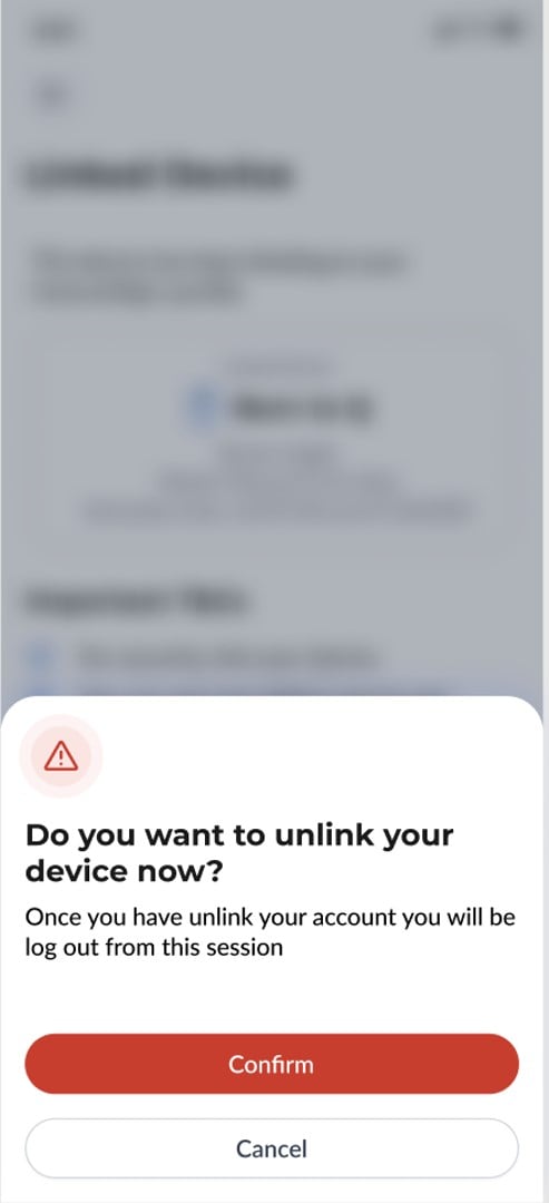 Step 3: To unlink successfully, select ‘Confirm’ on the confirmation prompt and complete biometric verification. |