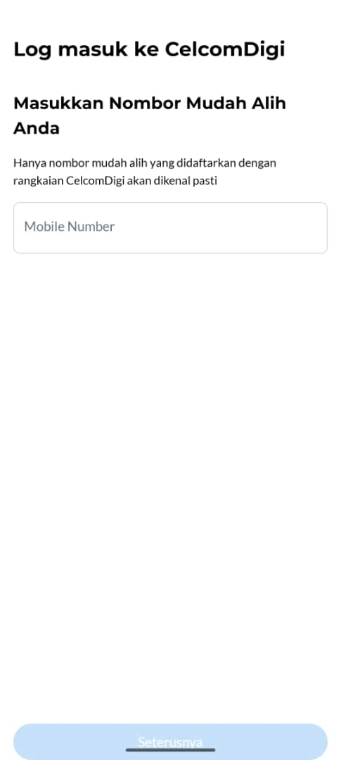 Langkah 3: Untuk log masuk kali pertama, masukkan nombor Celcom atau Digi anda. Tekan ‘Seterusnya’. |